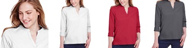 2.95 oz/yd² / 100 gsm, 92% nylon , 8% spandex spandex twill with moisture-wicking performance; performance nylon fine shirting offers a crisp, professional look while staying cool and comfortable; stretch for enhanced fit and restriction-free movement; Dyed-to-match pearlized buttons ; Luxury, comfort and performance in one; Tailored open neckline; Three-quarter sleeves with fashioned closure ; Bust darts for flattering feminine fit; Hi-low hemline; Active fit; Easy care;